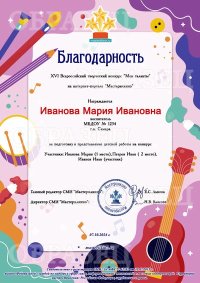 * Благодарственное письмо педагогу, заявившему 15 и более детских работ одновременно, оформляется бесплатно в электронном виде! Участвуйте группами!