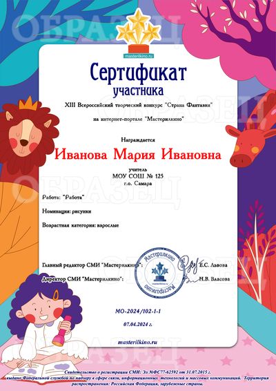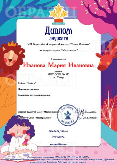 Свидетельство о публикации материала - 100 рублей. Свидетельство выдается автору работы, т.е. если автор работы - ребенок, то документ будет выдан на имя ребенка. Если автор работы - взрослый, документ оформляется на имя этого взрослого.