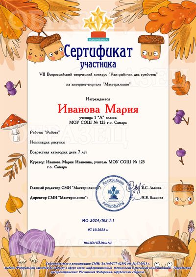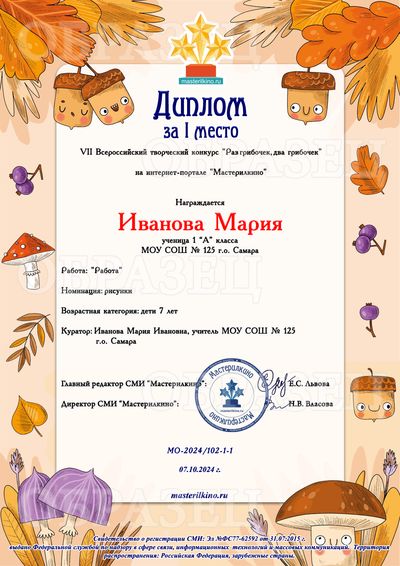 Свидетельство о публикации материала - 80 рублей. Свидетельство выдается автору работы, т.е. если автор работы - ребенок, то документ будет выдан на имя ребенка. Если автор работы - взрослый, документ оформляется на имя этого взрослого.